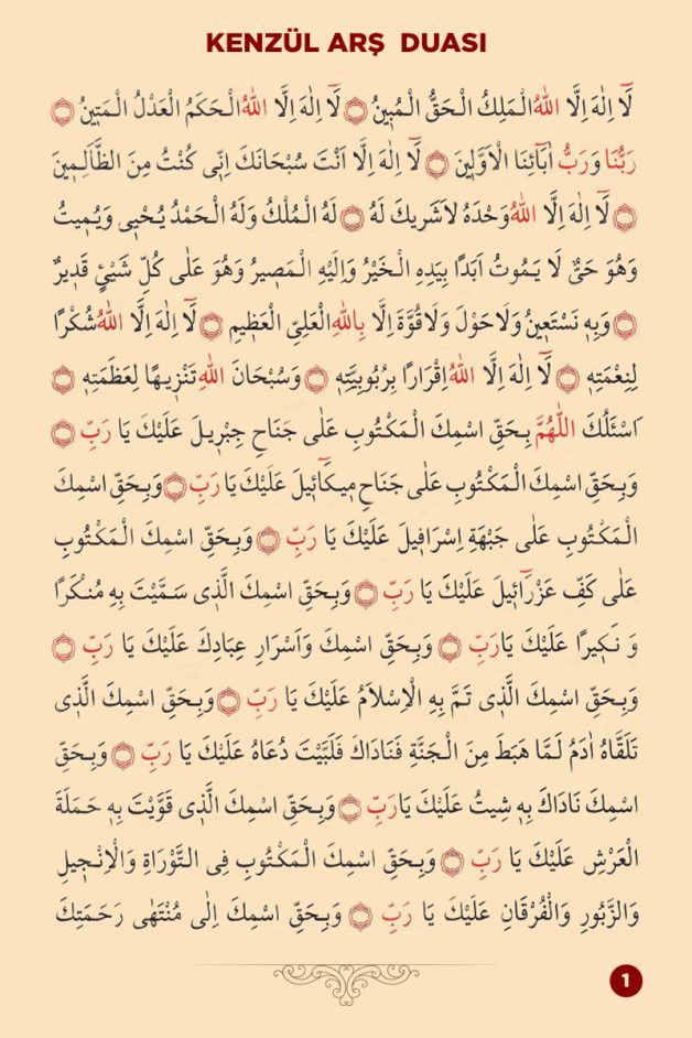Kanz al-'Arsh (the Treasury of the Throne) supplication is a prayer made in reverence to the divine names of Allah Almighty. There is no definite information concerning the author of the supplication Kanz al-'Arsh, which is included in the three-volume compendium of invocations of figures associated with Sufism, Majmu'at al-Ahzab (Istanbul: 1311), compiled by Gümüşhaneli Shaykh Ahmed Ziya'üddin, which also contains the Jaushan al-Kabir and other supplications, and with which Bediuzzaman was familiar. Also, Kanz al-'Arsh is mentioned in Bediüzzaman’s Rumuzât-ı Samâniyya, Barla Letters and Emirdağ Letters as a source of blessings.